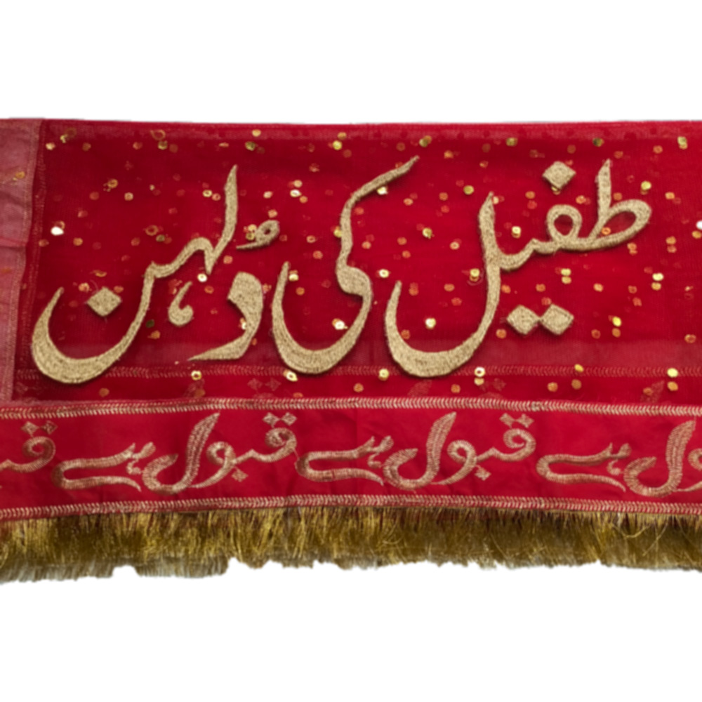Traditional Bridal Dupatta for Nikah Ceremony in PakistanIn every Pakistani wedding, the Nikah ceremony is considered the most sacred and emotional moment. Among the many customs that make this day special, one beautiful tradition is the use of a Bridal Dupatta. This dupatta is more than just a wedding accessory—it is a cultural symbol of modesty, respect, and blessings for the bride.This particular Nikah Dupatta measures two and a half yards in length and forty inches in width, making it ideal for traditional wedding rituals. Crafted in bright red fabric with golden embroidery, sequins, and decorative fringes, it perfectly reflects the festive spirit of a South Asian wedding. Many dupattas also have the word “Dulhan” (Bride) or special prayers embroidered on them, making the moment even more memorable.In Pakistan, using a bridal dupatta during the Nikah is a widespread custom across different provinces and communities. Families consider it a mark of honor for the bride, and in many households, the dupatta becomes a treasured keepsake passed down through generations. It often finds its place in the bride’s trousseau as a reminder of her wedding day.Even though modern weddings bring stylish gowns, designer outfits, and new trends, the traditional Nikah Dupatta remains timeless. It beautifully connects today’s brides with the cultural heritage of their mothers and grandmothers, keeping alive the essence of Pakistani wedding traditions.For brides and families planning their big day, choosing a handcrafted bridal dupatta adds not only elegance but also deep cultural meaning to the ceremony. It is more than just fabric—it is a symbol of blessings, purity, and love.